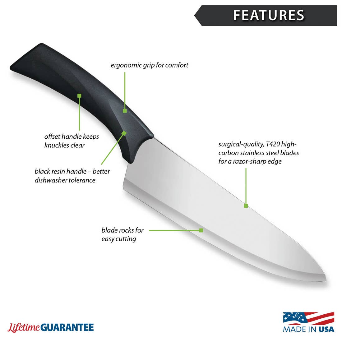 Take your chopping skills to a new level with the Anthem French Chef! The large cutting surface allows you to rock the knife back and forth, making dicing and mincing fun and easy, while the offset handle keeps your knuckles safe.