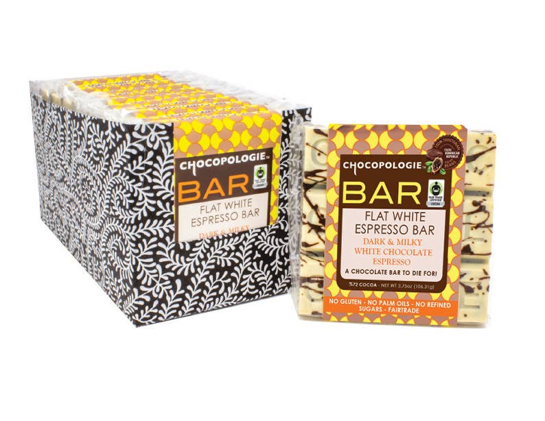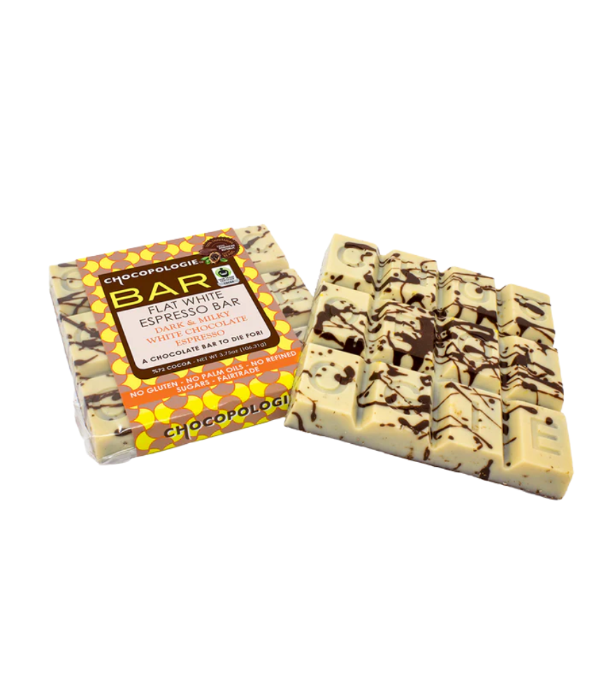 A chocolate bar with an extra caffeine kick! The flat white espresso bar is a 70% fair trade and organic dark chocolate bar with a top layer of white chocolate to simulate the look of a "flat white", and infused with Italian espresso beans.