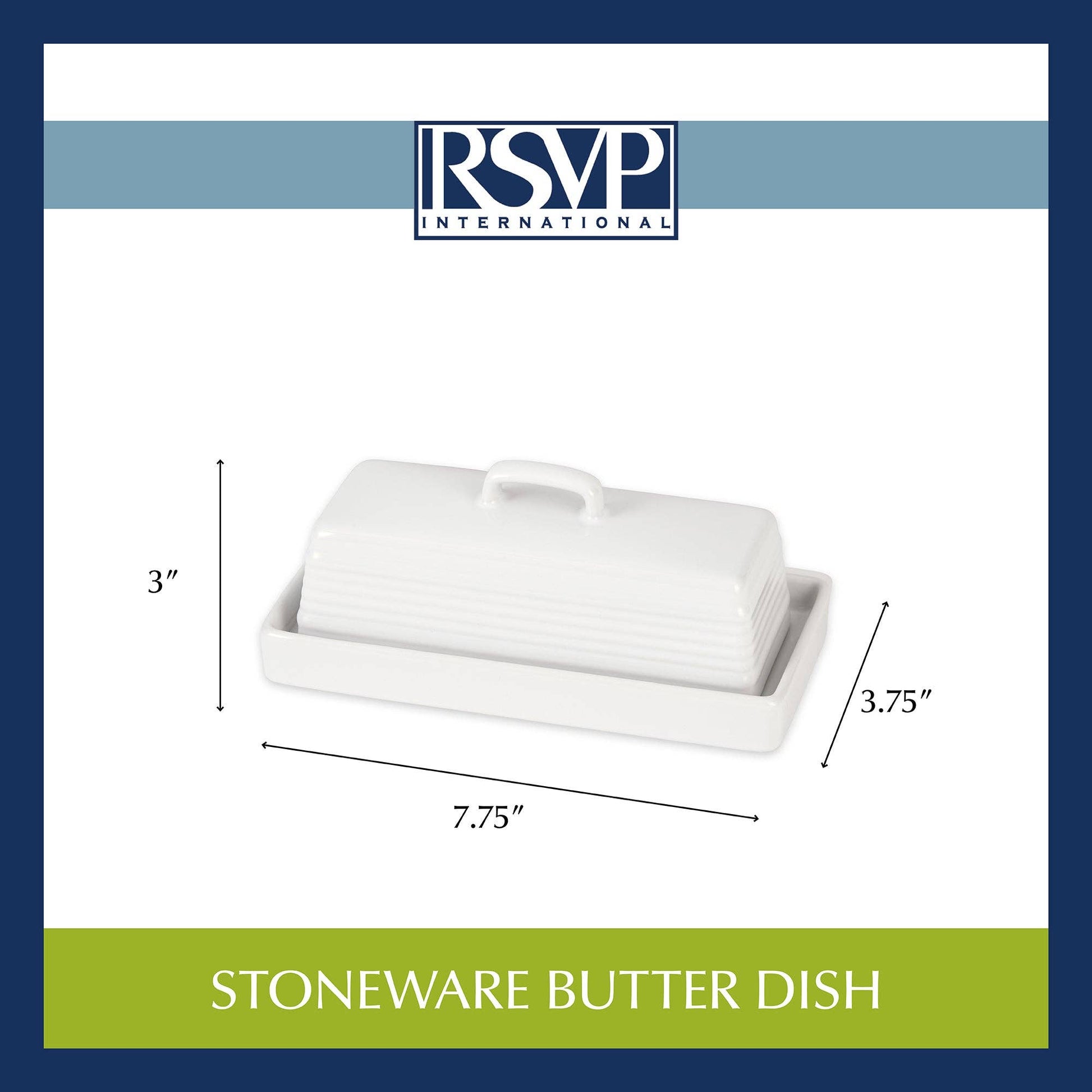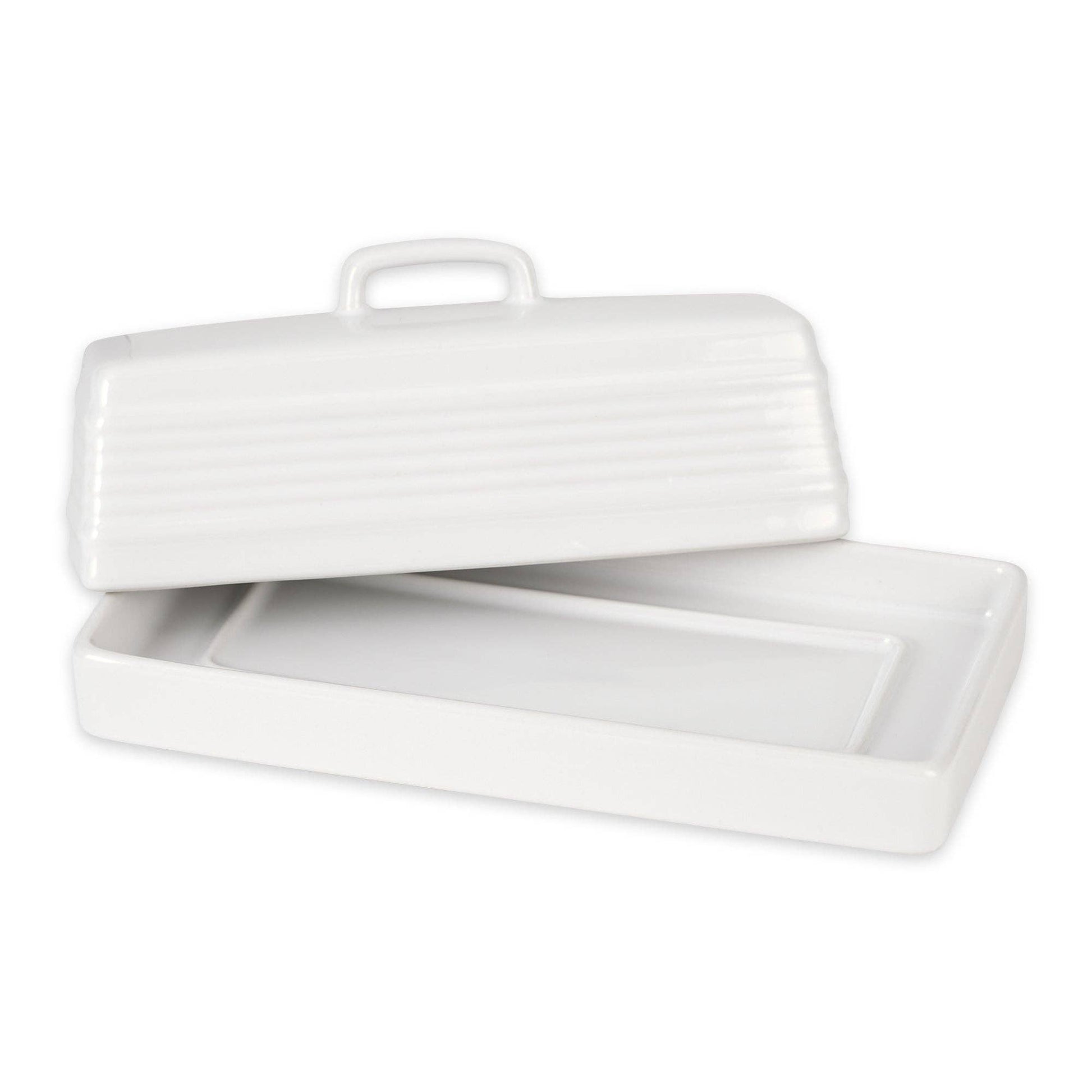 * Made from white stoneware, it features an inner ridge in the tray to keep the butter stationary and the lid securely in place.